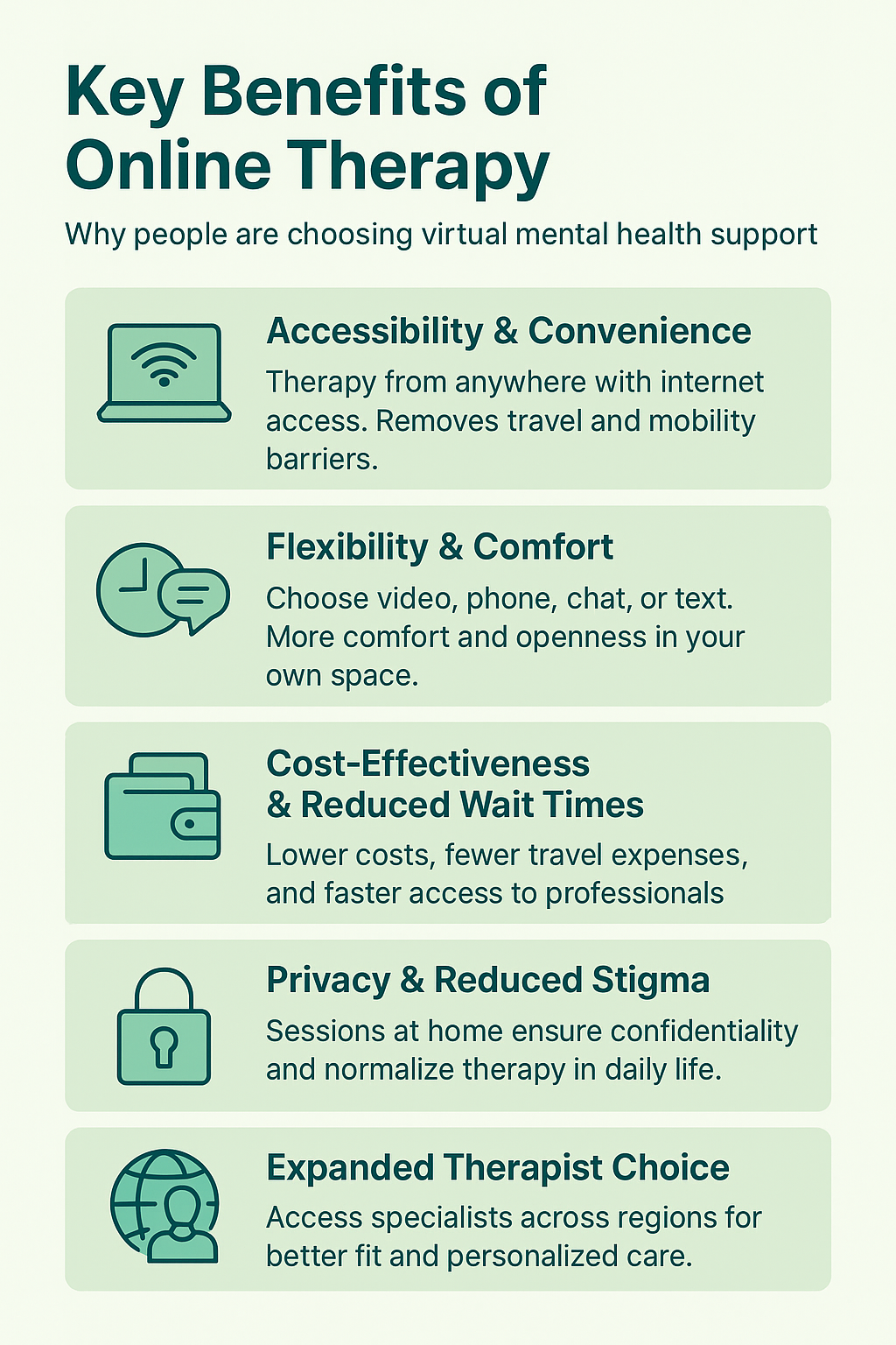 The main online therapy benefits include accessibility, convenience, lower costs, privacy, flexibility in communication, and access to a broader range of therapists.
